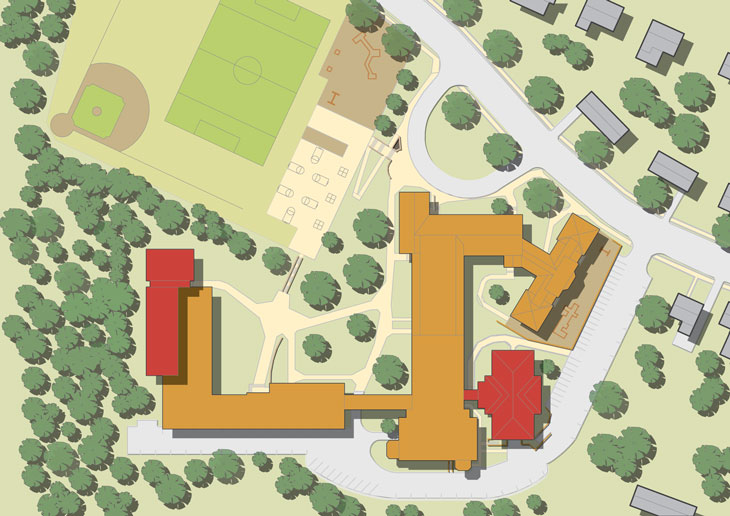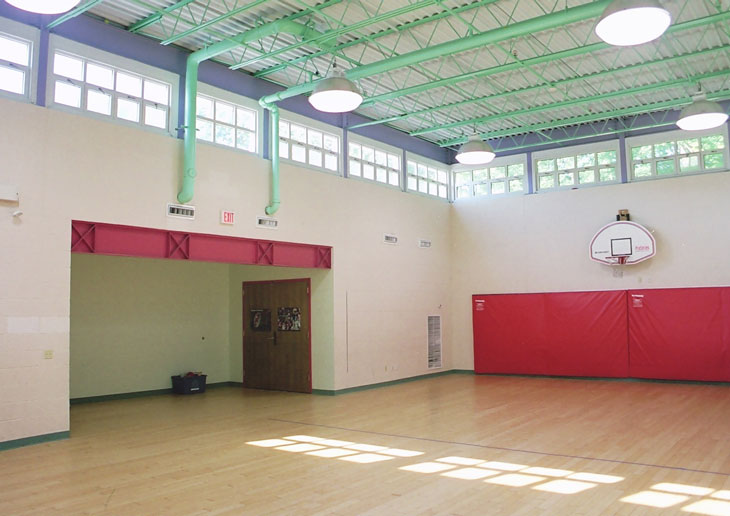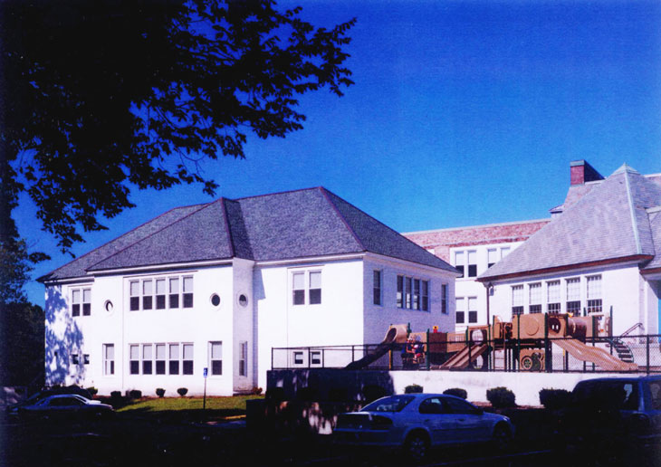 The renovation added a new two-story library/cafeteria addition in the courtyard of the 1938/1939 wing adjacent to the Kindergarten wing and a one-story addition to the 1951 wing that has three classrooms and an auxiliary gymnasium for younger grades.